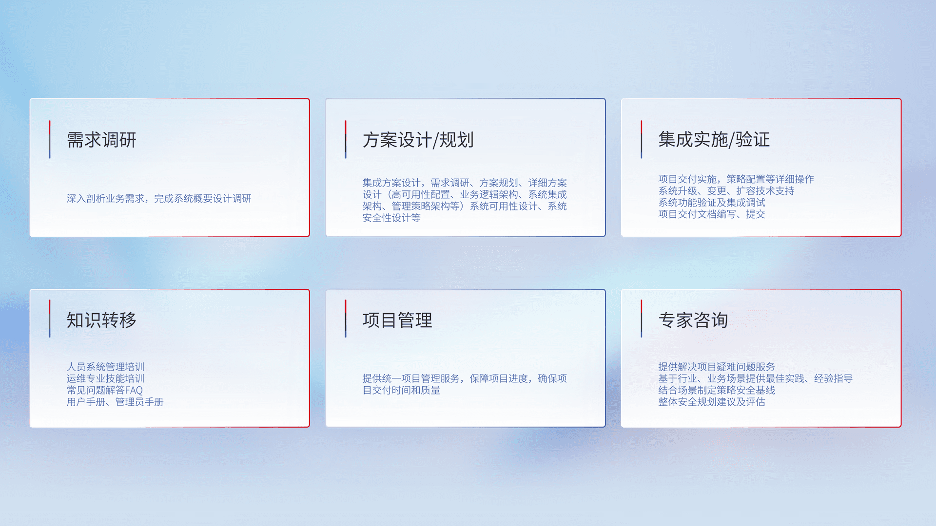 针对客户行业特性,,将宏观的安全战略和需求,,通过专业的交付服务,,,,实现项目落地,,为客户提供标准规范的集成交付服务。。。。